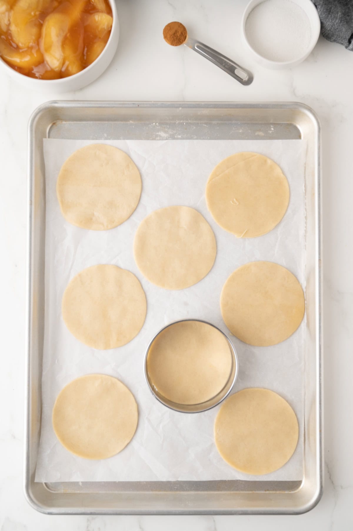 - Place one pie crust onto the baking sheet and cut 6 circles into it with the biscuit cutter. Discard the pie scraps or use in another recipe.