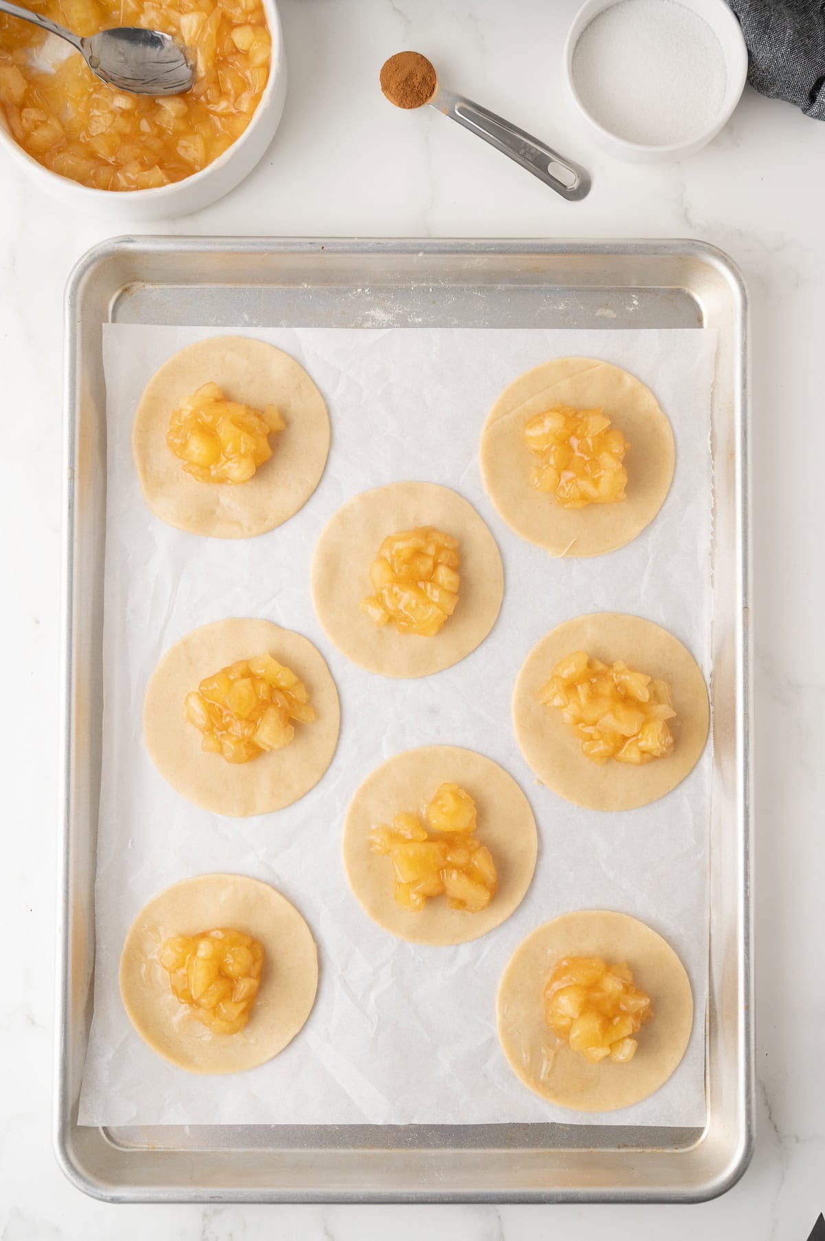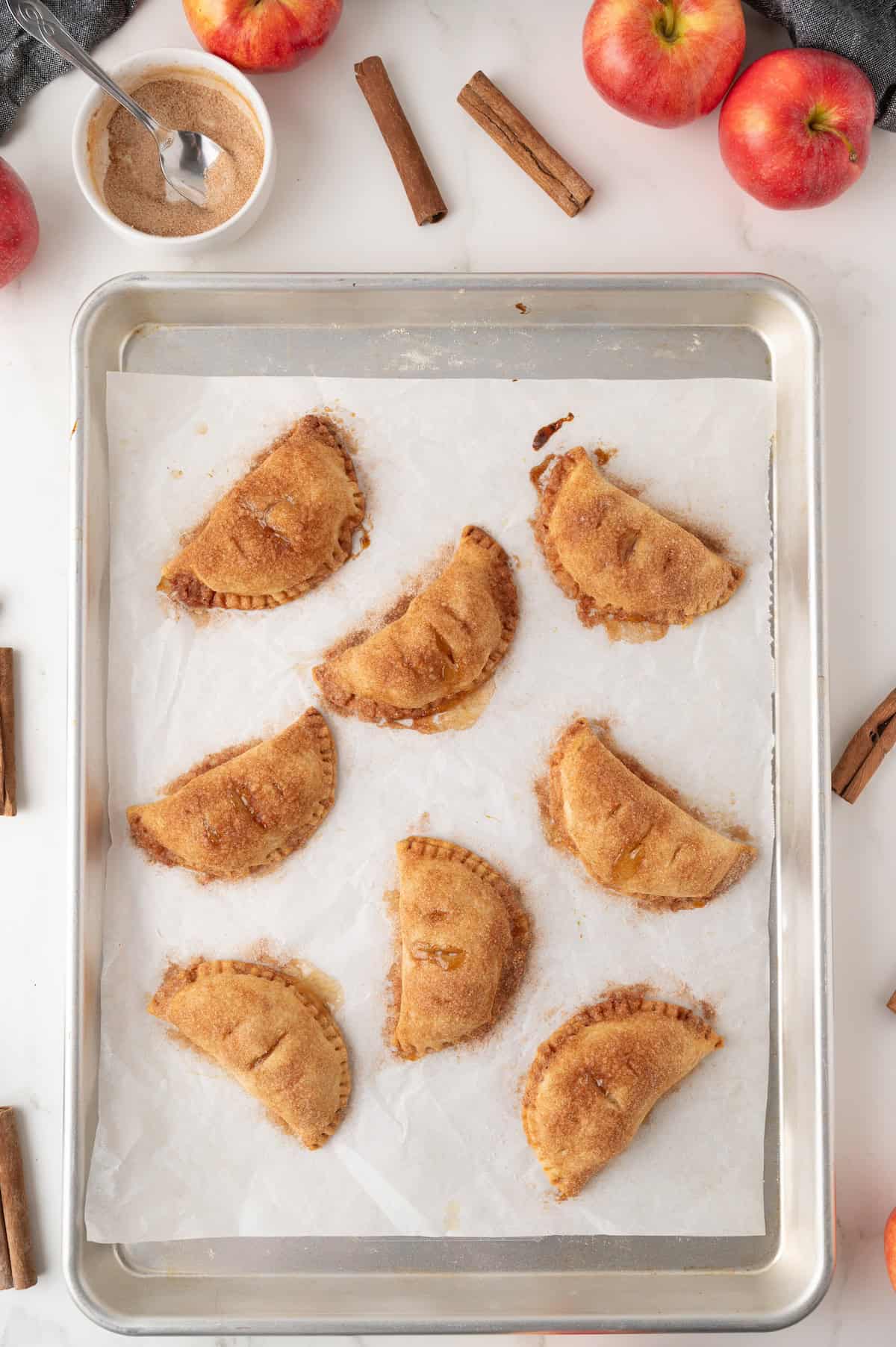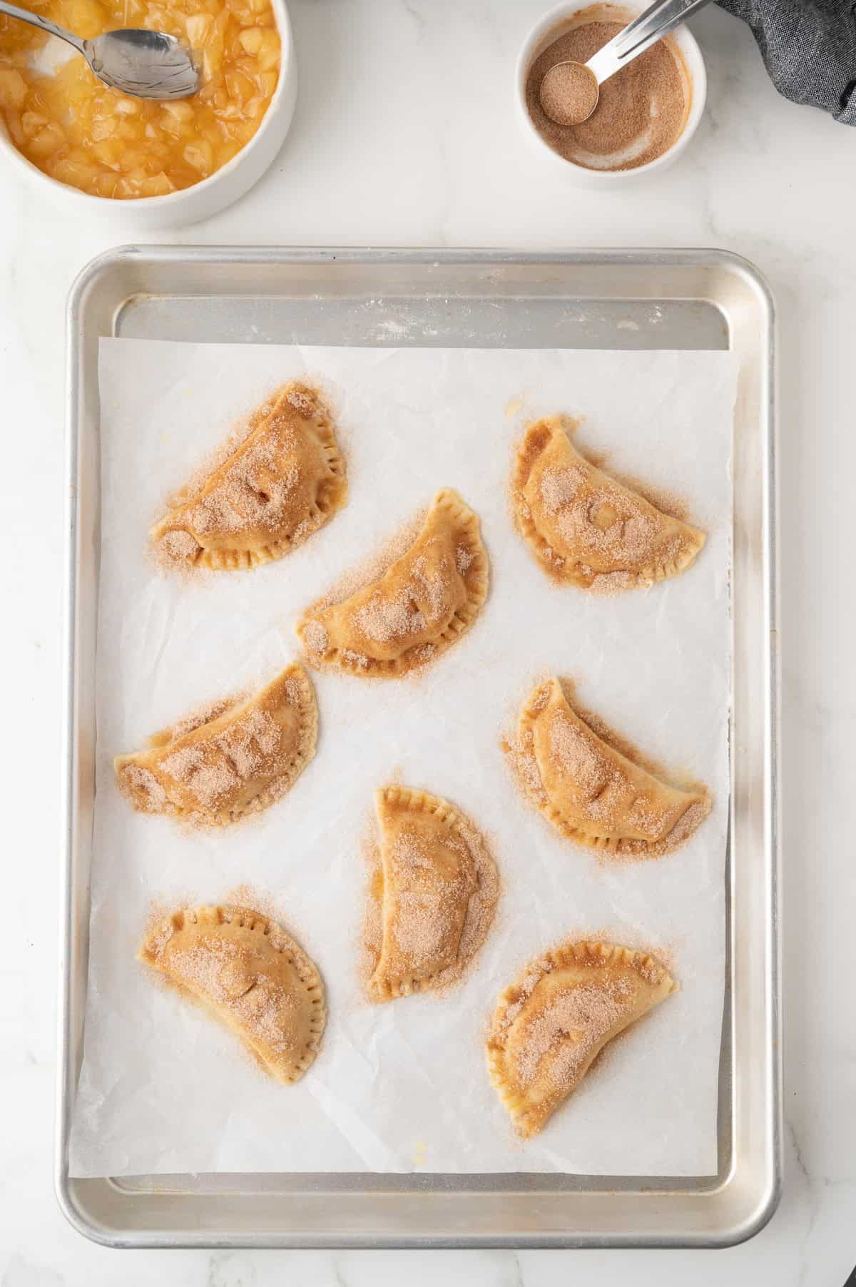 - Stir together the cinnamon and sugar in a small bowl. Sprinkle half of the mixture over the hand pies.