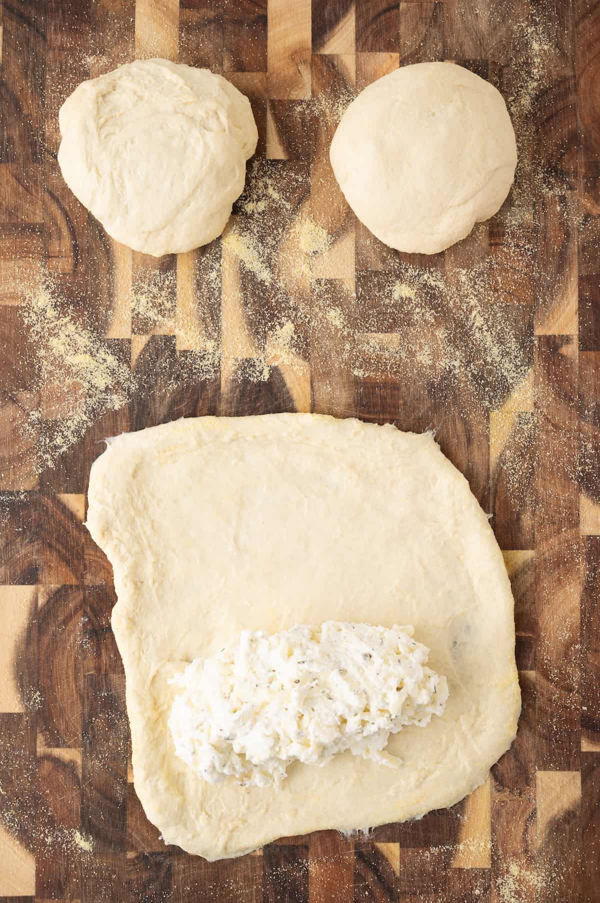 - Place ⅓ of the cheese filling onto one half of each dough circle.Fold the empty half over the filling and pinch the edges together. Press edges down with a fork to seal.