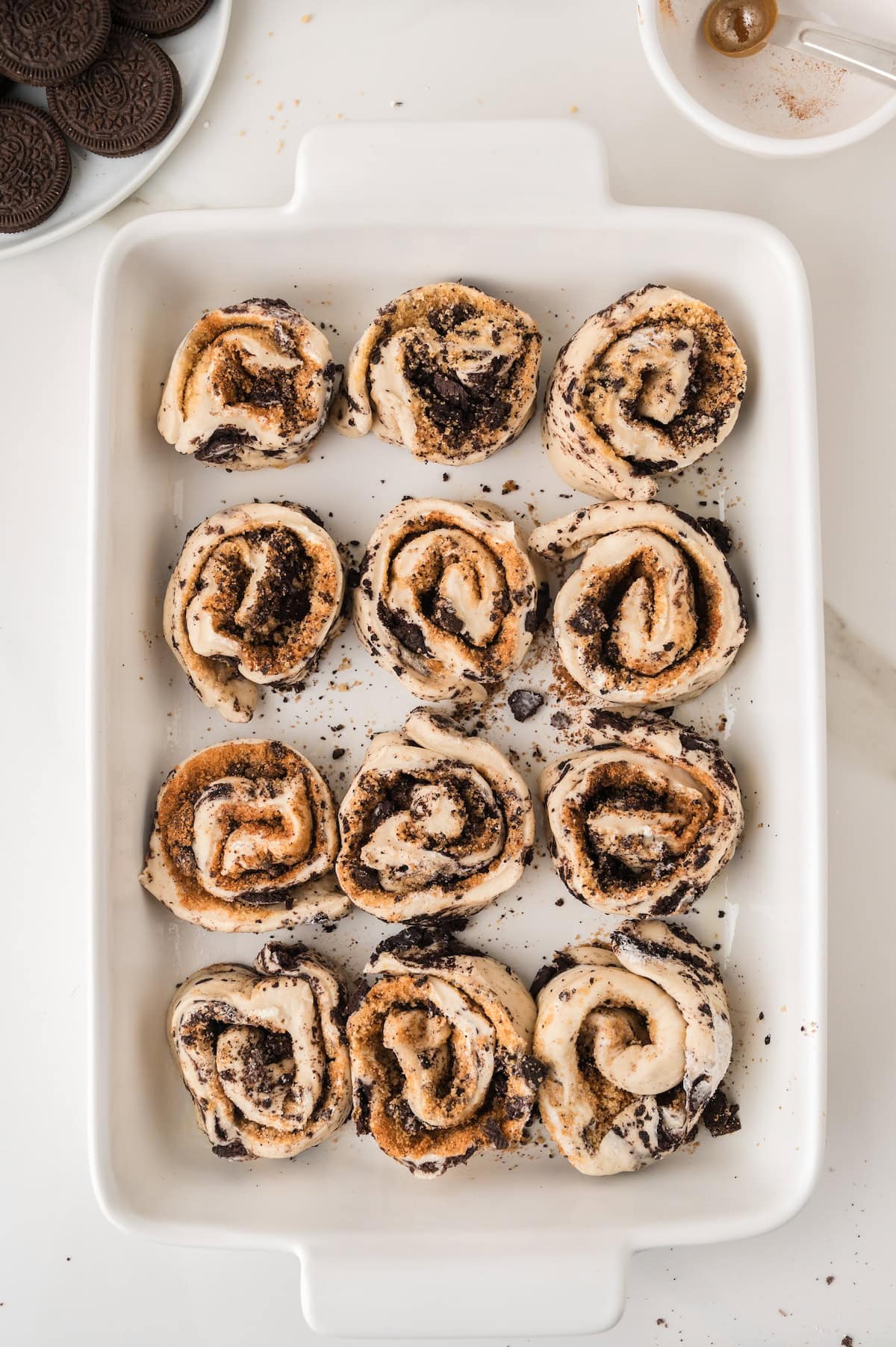 - Be sure to tightly roll up the dough after the Oreo filling is added to help them keep their shape, then reform as needed when placing into the baking dish.