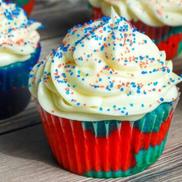 These delicious red white and blue cupcakes are made with blue and red cupcake batter and are stuffed with sugar sprinkles. I also call them "firecracker cupcakes" because when you get to the center, it's like a pop of sugar in your mouth! They are topped with a homemade cream cheese frosting and patriotic sprinkles.